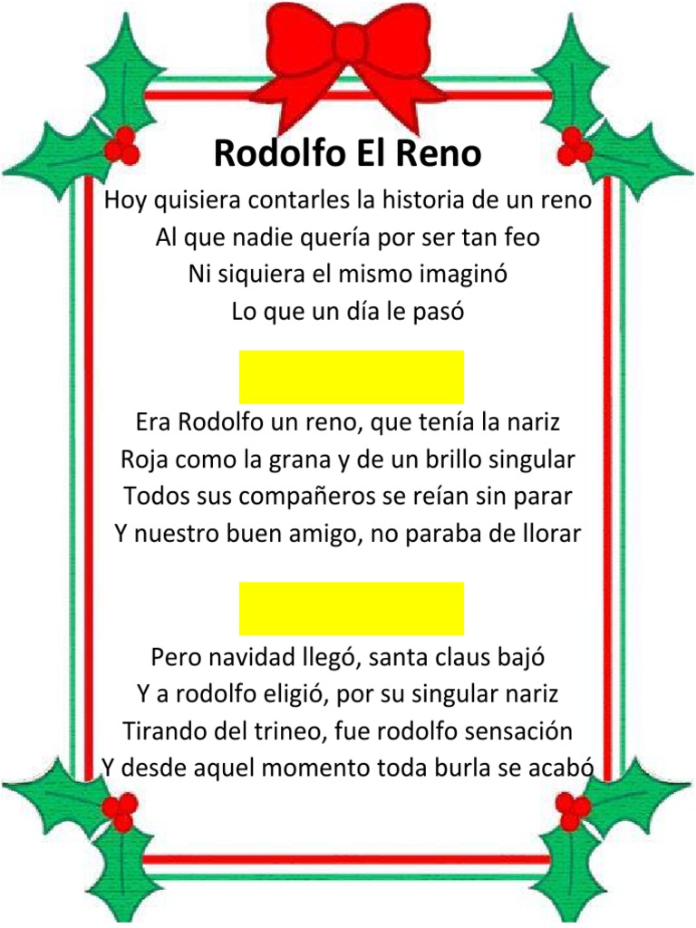Pero Navidad llegó y Santa Claus bajó Y a Rodolfo lo eligió por su singular nariz Tirando del trineo fue Rodolfo sensación Y desde aquel momento toda burla se acabó. Roja como una granada y de un brillo singular. Todos sus compañeros se reían sin parar.