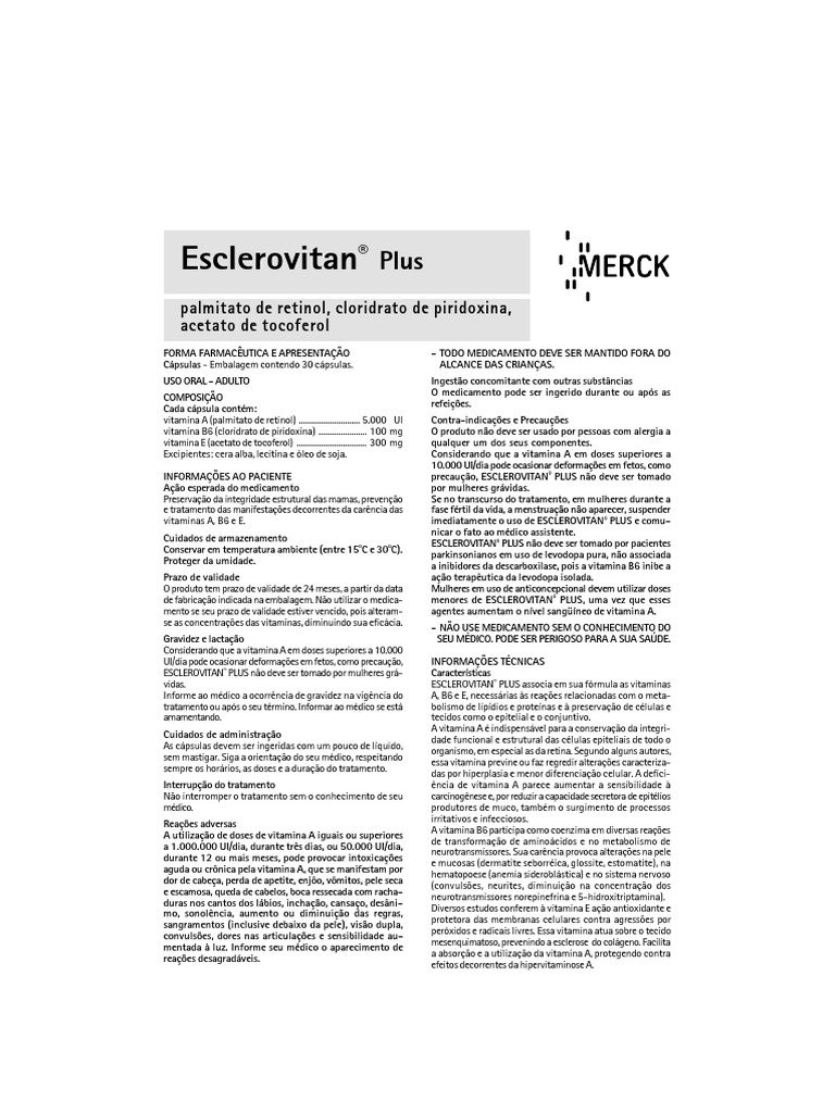 Mi ginecóloga me recetó esclerovitan E por displacia mamaria. Suplemento vitamínico em dietas restritivas e inadequadas na prevenção de cegueira noturnaxeroftalmia como auxiliar nas anemias carenciais e antioxidante. No son reacciones frecuentes del medicamento. Tengo 28 años y estoy padeciendo dolor de rodillas práctico deporte me puede ayudar el Esclerovitan Antioxidante con el dolor. Suplemento vitamínico em dietas restritivas. La posología será establecida por el médico en función del proceso a tratar y las características del paciente. El cuerpo produce algunos de los antioxidantes que usa para neutralizar los radicales libres. Vitamina A palmitato 5000UI clorhidrato de piridoxina vitamina B6 100mg acetato de alfatocoferilo vitamina E 300mg. Esclerovitan Plus Bula do remédio.